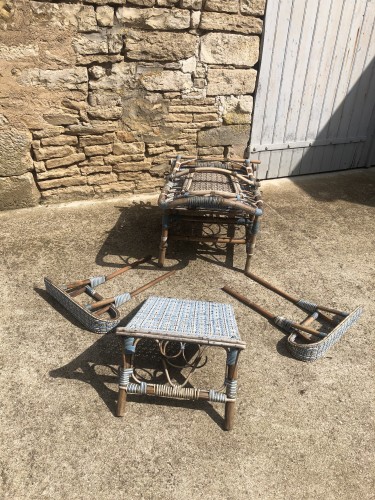 Old garden deck chair, winter garden. Old garden deck chair, winter garden. Napoleon III. Pretty sky blue and white colors. Removable armrests and footrest, adjustable and folding backrest. Dimensions: length 180 cm, width 60 cm. Add this object to your favorites Contact us for more details