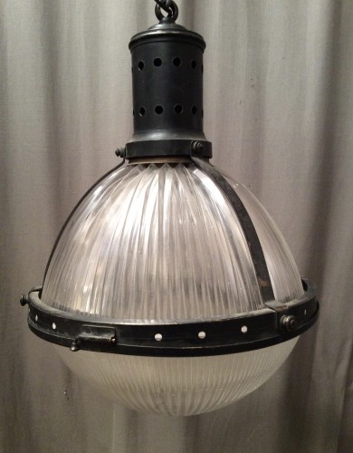Vintage Holophane suspension lamp. Large black patinated bronze suspension lamp and "Holophane" glass. Height 54 cms. Diameter 40 cms. Add this object to your favorites Contact us for more details