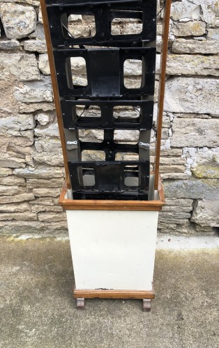 Old postcard display. Old very high drop-down postcard display. For 50 horizontal and 27 vertical cards. Wood, sheet metal. Dimensions: Height 2.45, width: 44.5 cm, depth: 25 cm. Add this object to your favorites Contact us for more details